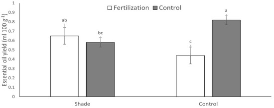 Fertilization significantly reduced the essential oil yield of chamomile in the open field, while no significant effect was observed under shade condition. The essential oil yield of chamomile was higher under shade for fertilized plants, and it was lower for the unfertilized ones (Figure 1).
