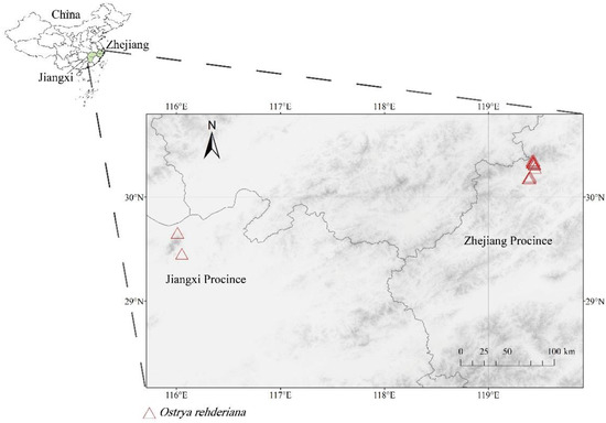 Ostrya rehderiana Chun, Betulaceae, is a narrow endemic species to Zhejiang Province (Tianmu Mountain, Southeast China) and is catalogued as a PSESP [18]. The species bears a great significance and unique value in Paleo flora studies [19]. O. rehderiana wood is used for furniture and building materials; however, the number of reproductive individuals has significantly decreased and currently suffers from a lack of recruitment caused by climate change [20]. Therefore, finding suitable cultivation conditions along with determining the spatial distribution of suitable habitat for this species under the current and future climate are of an immense importance.