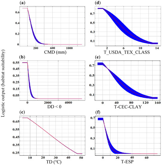 Response curves of the three most important climate (a–c) and the three most significant soil variables (d–f) in the MaxEnt climate model. Maximum entropy logistic output (also known as habitat suitability) is represented by the vertical Y-axis and the variable by the horizontal X-axis. When the logistics output value is greater than 0.5, the probability of species presence is higher than the ‘typical’ condition, indicating that condition is suitable for tree species. The red curves shown are the averages over 15 replicate runs; blue margins show ±1 standard deviation (SD) calculated over 15 replicates (See Table 1, for variables code).