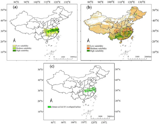 Distributions of the contemporary (1970–2000) suitable habitats of O. rehderiana: (a) climatic habitats, (b) soil and HF habitats, and (c) climatic habitats filtered by the soil and HF habitats.