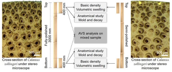Rattan canes of Calamus zollingeri Beccari and Calamus ornatus Blume grown in Sulawesi, Indonesia were collected from local suppliers for this study. Those canes were commercially polished using a custom-made sanding machine upon which sandpaper was used with a grit size of 220. The canes were 3000 mm long and belonged to three diameter classes, viz. 30, 20, and 15 mm. Both semi- and fully polished samples were used for C. zollingeri while only fully polished samples were used for C. ornatus. Samples of about 400 mm long were cut from the bottom and top ends of rattan canes to separate the mature and juvenile portions, respectively. Working samples for physical and anatomical studies were converted from these 400 mm internode samples (Figure 1). Only fully polished samples were used for testing anatomical characteristics and vapor sorption as no differences were expected between semi- and fully polished samples, except from removal of the epidermis and some part of the cortex tissues, as seen in Figure 1.