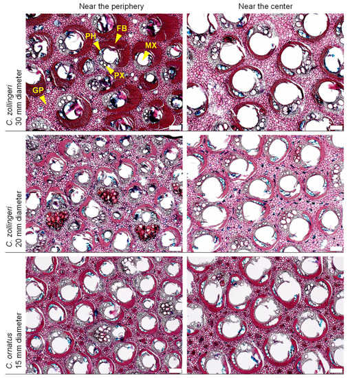 Light microscopic images of cross-sections of C. zollingeri and C. ornatus with different diameter classes. Arrow heads show MX = metaxylem, PX = protoxylem, PH = phloem, FB = fiber bundle, and GP = ground parenchyma. Scale bars = 200 µm.