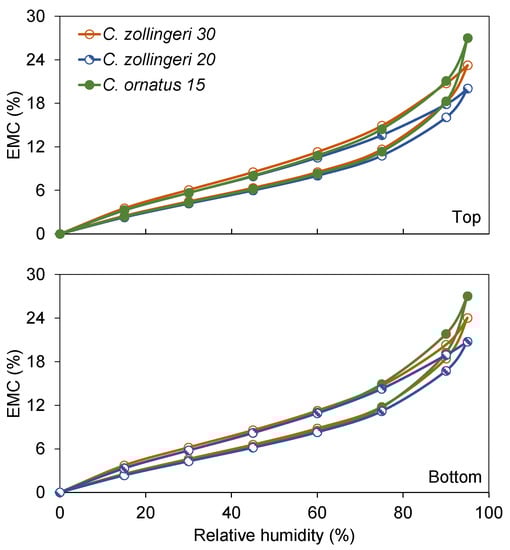The EMC of rattan samples increased with increasing RH from 0 to 95%. Identical EMC values were observed in the top and bottom samples within the same species. There were no differences in the EMC values of the samples at RHs below 60% during both adsorption and desorption runs. The moisture adsorption isotherms are similar to the one reported by Yang et al. [36]. The highest EMC value was obtained at 95% RH for sample C. ornatus, which was ca. 27%. The sharp upward bend above 70% RH is generally accepted to be related to the softening point of hemicelluloses [40]. Removal of the lignin increased the moisture sorption capacity of holocellulose micro-veneers at RH above 75% [40]. Although the sorption mechanism of the rattan cell wall could be slightly different than wood, it is thus assumed that the higher EMC value of the C. ornatus samples could be mainly related to the lower lignin content as compared to other rattan samples, as indicated in chemical composition analysis (Table 4). As expected, at RHs above 75%, C. zollingeri with a 20 mm diameter demonstrated lower moisture sorption in comparison with C. zollingeri with a 30 mm diameter and C. ornatus in the top and bottom parts during both adsorption and desorption runs. The effect of high lignin content in rattan with a 30 mm diameter on moisture sorption might be offset by higher extractive and ash contents in C. zollingeri with a 20 mm diameter. The moisture sorption results are in accordance with the volumetric swelling values and confirmed a better hydrophobicity of C. zollingeri with a 20 mm diameter as compared with the other rattan samples.