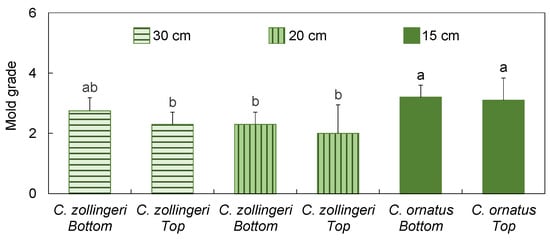Mold grading of rattan samples for different diameter classes. Error bars show standard deviations. Bars with different letters indicate that there is a significant difference (p ≤ 0.05), as determined by ANOVA and Duncan’s multiple range test.