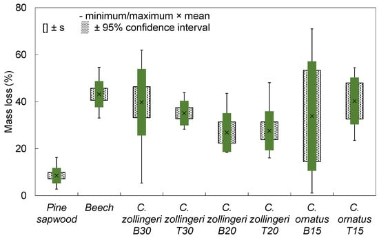 As white-rot decay has a common feature of degrading lignin, cellulose, and hemicelluloses, the resistance of lignocellulosic material to this fungus highly depends on the relative proportion of their compositional polymers, i.e., it depends on the lignin content, carbohydrate ratio, and lignin monomer composition (mainly guiaicyl lignin) [42,43,44]. High mass loss of C. ornatus samples compared with the other rattan samples could be related to their considerably low lignin content, as demonstrated in chemical composition analysis (Table 4).