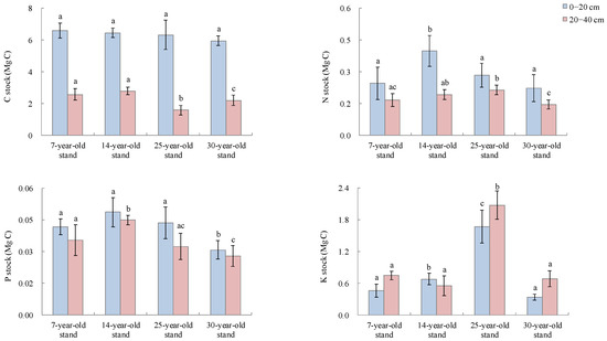 There is no significant difference in C stocks of the 0−20 cm soil layer, but the N, P, and K stocks in the 0−20 and 20−40 cm soil layers increased first and then decreased with forest stand age (Figure 2). The 14- and 25-year-old plantations displayed the highest P stock and K stock, respectively, whereas the lowest values of N and P stocks were all observed in the 30-year-old plantation. The K stocks were higher in the 20−40 cm soil layer than in the 0−20 cm soil layer except in the 14-year-old plantation; the C, N, and P stocks declined with increasing soil depth across all sites. The sequence of soil macronutrient stocks was as follows: C stock > K stock > N stock > P stock, except in the 20−40 cm layer of the 25-year-old plantation.