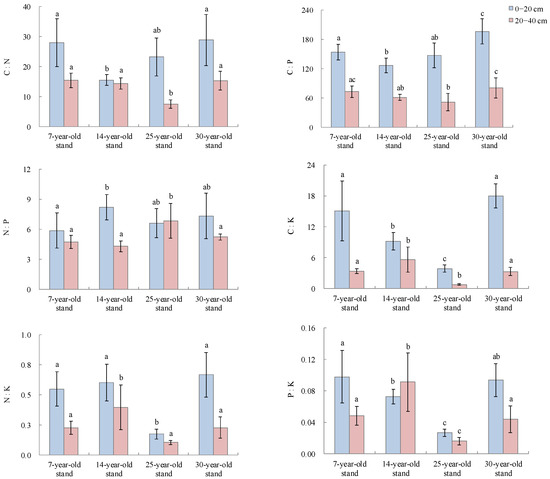 Under all plantation types, C:N, C:P, N:P, C:K, N:K, and P:K ratios were higher in the 0−20 cm soil layers than in the 20−40 cm, except for P:K in the 14-year-old plantation and N:P in the 25-year-old plantation (Figure 3). The ratios of C:N and C:P first decreased and then increased, with a maximum level in the 30-year-old plantation. The ratios of C:K in the 0−20 and 20−40 cm soil layers were highest in the 30- and 14-year-old plantations, respectively. The variation in the N:K ratio was similar to that in the C:K ratio, but the N:K ratio was much smaller, ranging from 0.10 to 0.67 for all depths. The lowest C:K, N:K, and P:K ratios were all observed in the 25-year-old plantation. The stoichiometric traits of the soil were ranked as C:P > C:N > C:K > N:P > N:K > P:K in the 0−20 cm soil layer of the 7-, 14-, and 30-year-old plantations, whereas in the 20−40 cm soil layer, the sequence was C:P > C:N > N:P > C:K > N:K > P:K except for the 14-year-old plantation (Figure 3).