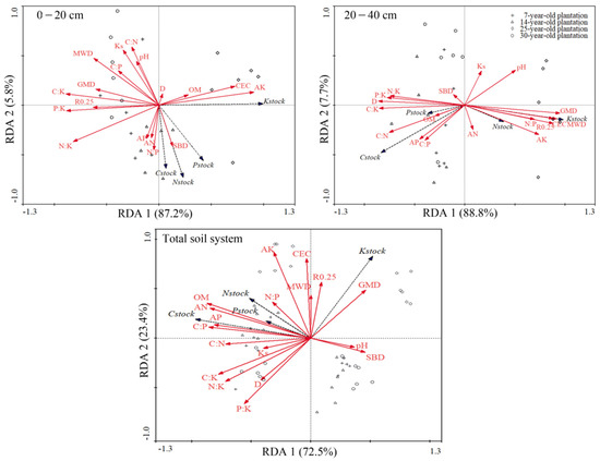 Multivariate statistical analyses were performed using CANOCO 5.0 (Microcomputer Power, Ithaca, NY, USA) and Statistical Product and Service Solutions 22.0. The Shapiro–Wilk test was used to verify the statistical distribution, and nonnormally distributed values were log10 transformed. One-way analysis of variance (ANOVA) was used to analyze the statistically significant differences and the variance between treatments. Stepwise multiple linear regression and redundancy analysis (RDA) were conducted to determine the strength of possible relationships between soil macronutrient stocks and soil physicochemical properties at different stand ages and soil depths, respectively.