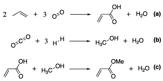 The main reactions resulting in the production of methyl acrylate, (a) the synthesis of acrylic acid, (b) the production of methanol and (c) the esterification of acrylic acid.