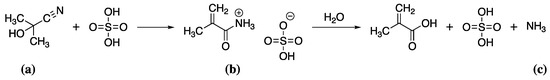 Methacrylates are prepared from methacrylic acid (MAA) [97]. MAA is produced in a multi-step process involving the reaction of acetone with sodium cyanide at 40 °C to give acetone cyanohydrin (Scheme 3a), which is converted to methacrylamide sulfate (Scheme 3b) by reaction with sulfuric acid at 180 °C and finally hydrolysed to give MAA (Scheme 3c).