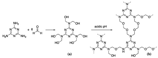 Aminoplasts are thermosetting polymers formed by condensation reactions, of which there are two main types-urea-formaldehyde and melamine-formaldehyde resins. Both resins have been used in wood conservation in the past. However, issues with the toxicity of urea-formaldehyde have led to its replacement with the less toxic melamine-formaldehyde, marketed under the name Kauramin [3]. This is one of few commonly used non-reversible wood consolidants. As such it is generally reserved for the most significantly degraded wood requiring consolidants of greater mechanically stability than is provided with standard PEG or bio-based consolidants. The low molecular weight of the monomers means MF consolidants can penetrate deeply into the wood leaving a rigid 3D polymer network after polymerisation. MF resin synthesis requires the pre-synthesis of both melamine and formaldehyde [99]. Commercial melamine production requires urea as a feedstock. Urea is produced by the high temperature (180–210 °C), high pressure (150 bar) reaction of ammonia (NH3) and carbon dioxide (CO2) forming ammonium carbamate, which is then dehydrated to urea [100]. Urea is then heated to cause decomposition to cyanic acid and ammonia [101]. Cyanuric acid is formed from the polymerisation of cyanic acid, which condenses with the evolved ammonia to form melamine. The off-gas from the melamine production contains such large quantities of ammonia that it is often funnelled off to create feedstock for the further production of urea, helping to reduce the environmental impact of the production cycle, even if only to a small degree. Formaldehyde is produced by the catalytic oxidation of methanol over a silver metal catalyst at 650 °C [102]. Methylolation or the formation of MF pre-polymer is carried out by mixing melamine with formaldehyde in a 1:6 ratio at approximately 60 °C (Scheme 4a) [99].