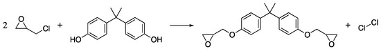 The reaction of bisphenol A with epichlorohydrin to give DGEBA.