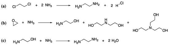 The synthesis of ethylenediamine from 1,2-dichloroethane (a) and the ethanolamine (b,c).