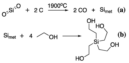 Lastly, alkoxysilanes are a relatively new addition to the wood conservation toolkit but have gained increasing popularity in recent years [111,112,113,114]. Alkoxysilanes have already been heavily used in the waterproofing and fire retardancy of construction wood, particularly for external applications, so their transfer into the conservation field is not surprising [115,116,117]. Moreover, they are a major component of almost all commercially available silicon products, thus the synthesis of these polymers is on an industrial scale [118]. The production of alkoxysilanes is one of the most energy-intensive of all the production processes described so far. Mined sand (SiO2) is carbothermally reduced at 1900 °C to give pure silicon (Simet), which is then reacted with the corresponding alcohol to give the desired alkoxysilane [118], Scheme 7.