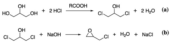 The reaction of bio-glycerol with HCl to give 1,3-dichlor-2-propanol (a), which is further reacted with NaOH to give epichlorohydrin (b).