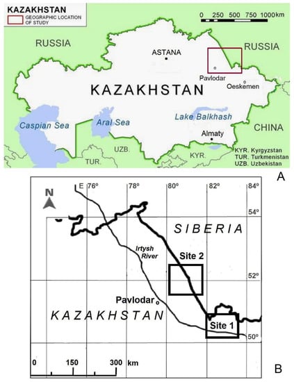 The intra-continental semi-arid forest ecosystems of the Irtysh basin geographically encompass the sandy-base forests of the Semey–Orman Nature Reserve (Site 1–Beskaragai) and the Hertis–Orman Nature Reserve (Site 2–Chaldai) of the Pavlodar Region (Figure 2). These steppe pine forests are situated on sandy alluvial plains around the confluence of the Ob and Irtysh Rivers forming the principal territorial discharge network of SW Siberia. The plains are geologically structured by quartz-dominated sandy-gravels blanketed by silty-clayey overbank deposits. The adjoining elevated relief (250–600 m asl) is built by the chains of weathered granitic and limestone hills interspersed by flat to undulating plains and small geomorphic depressions. The present climate is strongly continental with pronounced daily temperature fluctuations. Arid springs and hot summers (with temperatures of up to +45 °C) contrast with relatively wet falls and cold, dry winters (with temperatures down to −45 °C). The average annual rainfall amounts to 250–300 mm.