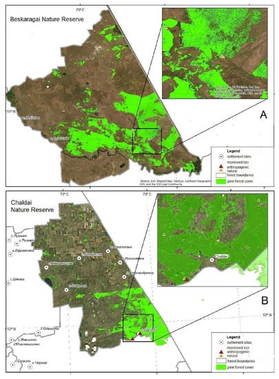 GIS vegetation cover projection of the distribution of the pine forests in the Beskaragai (A) and Chaldai (B) Nature Reserves.