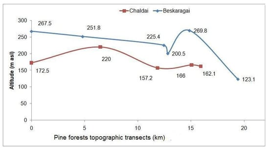 The Beskaragai area transect cutting through the Beskaragai ribbon-like pine forest nature protection area extends 20 km in the SW direction at elevation 200–270 m asl (Figure 3). The bio-geographic profile displays a change in the local relief following the sequence: elevated hills—gentle hills—undulating plains with a gradual decrease in tree heights (Figure 4A–C). Each element of the geo-relief corresponds to a certain type of forest: dry forest on the highlands, dry forest of the gently rolling hills, dry forest of the hilly western area and lowland forest in the river valleys. The geo-ecological profile of the Beskaragai site is characterized by marked soil-type changes. Depending on the location of the test plot (TP) area, the following pedogenetic types were encountered: loose regosolic sandy soils, poorly developed sandy brunisols, low-podzolized soils [57]. The agro-physical properties of the pedogenic horizons were assessed by the degree of top ground moisture corresponding to the extremely dry to dry soils.