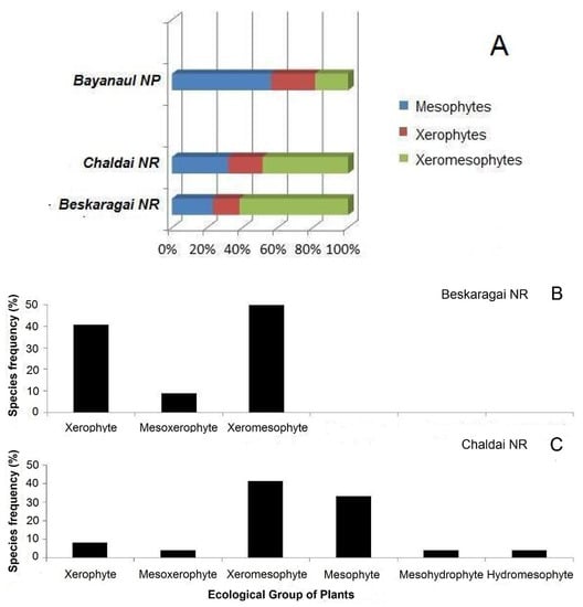 Ecological groups of plants of the broader area within the Bayanaul Nature Park, the Chaldai and Beskaragai Nature Reserves (A); and the Beskaragai upland pine forest (B) and the Chaldai plain pine forest (C).