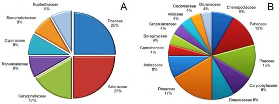 The Beskaragai forests are characterized by the predominance of grasses and sedges. Based on the particular geomorphic relief, two types of the arboreal cover (i.e., the semi-dry upland forests and more humid plain forests) were identified, with the increased species diversity in the latter. The undergrowth cover of the upland pine forest largely encompasses species of 7 plant families—Poaceae (25%), Asteraceae (25%) and Caryophyllaceae (17%), with the remaining taxa of Ranunculaceae, Cyperaceae, Scrophulariaceae, Euphorbiaceae less represented (14% in total) (Figure 6A). The richer spectrum found in the plain forests accounts 24 species of 14 families—Poaceae (13.8%), Asteraceae (13.8%), and Equisetaceae, Brassicaceae, Caryophyllaceae, Scrophulariaceae (altogether 27.6%). For the herbaceous plants, the following characteristics were revealed: 60% projective cover degree, the average height 30 cm, a two-layered (grasses-sedges) community structure. The phenological state of herbaceous plants is in the phase of fruit and seed ripening.