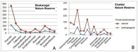 The floristic composition of the pine forests phytocenosis in the Beskaragai and Chaldai nature reserves’ sites mirrors the natural factors affecting the plant communities of the NE Kazakhstan pine forests with some significant differences recorded at the investigated loci in terms of natural and invasive plant species (Figure 6 and Figure 7).