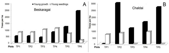 The Chaldai pine forest regeneration process (Figure 8B) shows a significantly higher density of young pine seedlings and growth in comparison with the Beskaragai pine forest amounting to 2.112 units/ha of young growth and 800 units/ha of young seedlings. This indicates a rather positive restoration dynamic of the forest ecosystems. At more favorable growing conditions, the amount of self-sowing reaches 1.700 pcs per ha [58]. At the Chaldai forest’s TP3 and TP5 transect loci, the absence of young seedlings reflects the high projective cover rate of the herbaceous plants and spiraea young growth preventing the natural arboreal cover restoration along with forest-adverse anthropogenic actions (cattle grazing). Spring season climatic conditions (ground humidity and temperature) are seen as the primary factors determining the variations in seedlings’ growth and the pine tree biomass increase [59].
