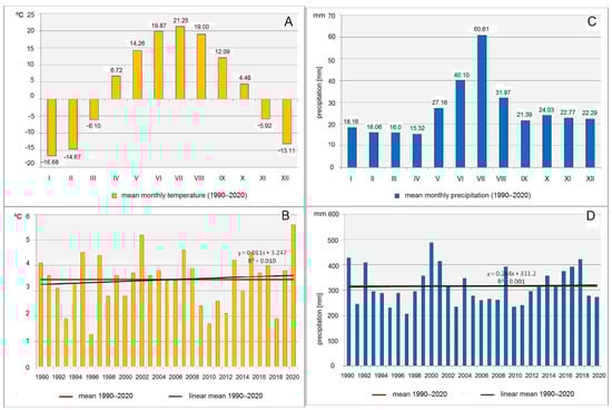Mean air temperature and precipitation records for NE Kazakhstan for the 1990–2020 period. (A) Monthly mean temperature; (B) annual mean temperature with a trend-line and regression equation of the MAAT anomalies showing just a slightly rising regional temperature during the last ten years; (C) monthly mean precipitation; (D) annual precipitation record with a minor long-term precipitation increase over the past decades (analysis of the raw meteorological data; the Pavlodar Meteorological Station).