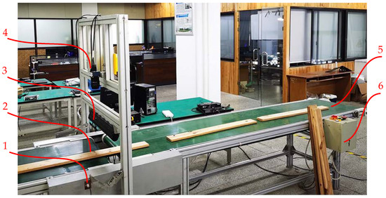 Image acquisition device: (1) photoelectric sensor, (2) solid wood board, (3) linear light source, (4) CCD camera, (5) belt conveyor, and (6) sample solid wood floorboard.