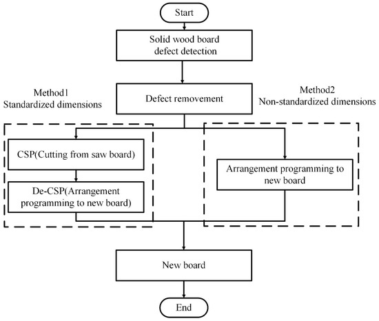 The flow chart of solid wood board defect removal/board reconstruction is shown in Figure 2.