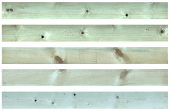 Figure 4 shows five pieces of solid wood board raw materials randomly selected from a batch of SPF (Spruce-pine-fir), plain sawn, which are 1000 mm long, 100 mm wide, and 10 mm thick. Each board has some defects. The defects in the board will have a certain impact on the mechanical properties and aesthetics of the splicing board. Therefore, it is necessary to cut the defects from the board according to certain standard sizes.