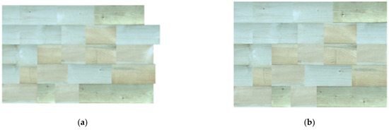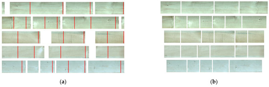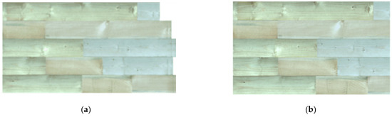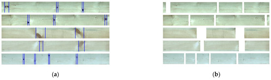 According to the principle that knots need to be removed, the target detection algorithm was used to identify the types and sizes of defects, and the cutting point of defects was obtained, as shown in Figure 5a. After the wood defects were removed according to the blue line, several segments of wood were obtained, as shown in Figure 5b. The wood size after sawing is no longer in line with the standard size of processing. Thus, it is necessary to cut it into a standard size.