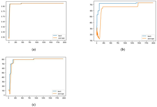 The function value of optimal individuals in Figure 9a is , which converges quickly, with the best value of 0.83 after 750 generations in the elite genetic algorithm. The function value of optimal individuals in Figure 9b is , with the best value of 727 after 1390 generations in the elite genetic algorithm. The function value of optimal individuals in Figure 9c is , with the best value of 814 after 899 generations in the elite genetic algorithm.