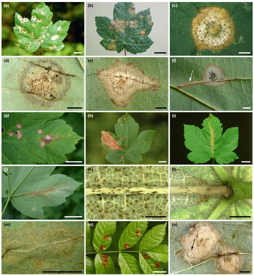 Galls, natural necrotic lesions and conidiomata of Apiognomonia hystrix on living leaves of Acer pseudoplatanus and Fraxinus excelsior. Acer pseudoplatanus (a–m): galls and necrotic lesions associated with Dasineura vitrina (a) and Drisina glutinosa (b); conidiomata of A. hystrix associated with Da. vitrina, upper side (d) and Dr. glutinosa, lower side of the leaf (d,e); anthracnose associated with Da. vitrina (f) and Dr. glutinosa (g); galls of Dr. glutinosa surrounded by necrotic leaf section (h); anthracnose on leaves associated with A. hystrix, no insect-related damage (i,j); conidiomata of A. hystrix on necrotic part of the leaf (k–m); Fraxinus excelsior (n,o): necrotic lesions associated with Dasineura fraxinea (n); conidiomata of A. hystrix on lower side of the leaf associated with galls of Da. fraxinea (o); scale bars: (a,b) = 20 mm, (c–f) = 2 mm, (g–j) = 20 mm, (k,l) = 2 mm, (m,n) = 20 mm, (o) = 2 mm.