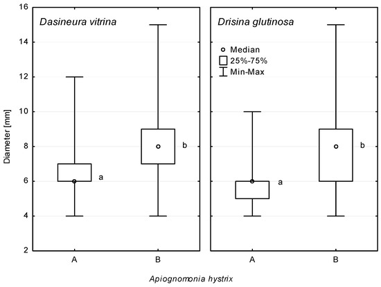 Diameters of necrotic lesions on leaves of Acer pseudoplatanus inhabited by Dasineura vitrina and Drisina glutinosa with (B) or without (A) co-occurrence of Apiognomonia hystrix infection. Values indicated with the same letters have been determined significantly not different at α = 0.05 in Mann–Whitney U test.