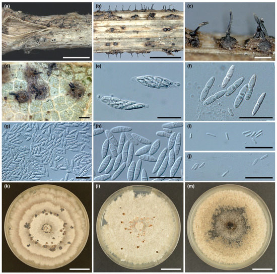 Conidiomata produced on necrotic areas of leaf blade were sub-peridermal, separate, visible as brown nodules, with a diameter of 0.15–0.6 mm (Figure 1c,d), while conidiomata on leaf veins were often more elongated, with a diameter of 0.2–0.8 × 0.2–0.6 mm (Figure 1k,l). Conidiophores were branched at the base, cylindrical, narrowing to the tip, 12–23 × 2.7–3.5 µm. Conidia were hyaline, fusiform, 1-septate, straight or slightly curved 10.0–19.0 × 2.5–4.5 µm (mean = 13.27 ± 2.28 × 3.11 ± 0.38, n = 90) (Figure 3g). Microconidia were single-celled, hyaline, club-shaped, 4–7 × 1.2–1.5 µm (Figure 3i). Microconidia were observed at the end of the growing season together with macroconidia or in separate conidiomata. For comparison, both types of in vitro-grown conidia are presented in Figure 3h,j.