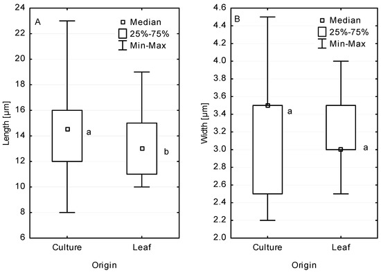 Length (A) and width (B) of Apiognomonia hystrix macroconidia produced in cultures and in necroses on leaves. Groups indicated with different letters in Mann–Whitney U test are significantly different at α = 0.05.