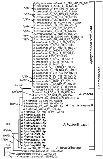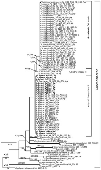In the three-gene phylogeny, the most prominent clade within the Apiognomonia group contains two subclades, separating A. errabunda and A. veneta isolates. Both the A. errabunda/A. veneta clade and the A. errabunda and A. veneta subclades received very high node support values in all three phylogenetic analyses.