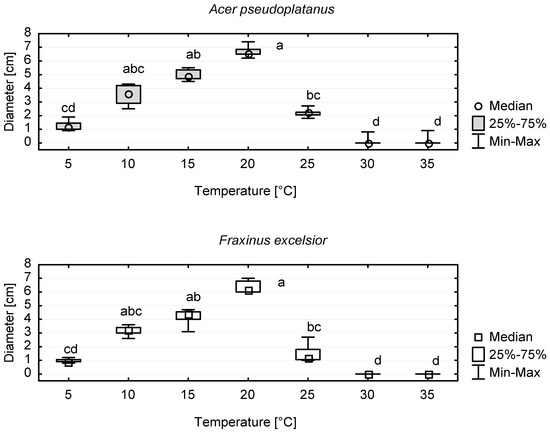 Diameters of Apiognomonia hystrix colonies isolated from Acer pseudoplatanus and Fraxinus excelsior after 10 days of growth at various temperatures. Values indicated with different letters have been determined significantly different at α = 0.05 in Kruskal–Wallis test.