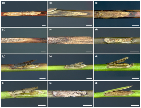 Occurrence of necrotic lesions on petioles of Acer pseudoplatanus and Fraxinus excelsior, eight weeks after wound inoculation with Apiognomonia hystrix. A. pseudoplatanus (a–h): extensive necrosis with light discoloration of necrotic tissues and with conidiomata of A. hystrix (a–d), petiole of fallen leaf with A. hystrix conidiomata covering the entire necrosis surface (e), inoculation wound covered with conidiomata, no tissue necrosis within the surrounding area (f), inoculation wound without developed conidiomata, no tissue necrosis within the surrounding area (g), control petiole without necrotic lesion (h); F. excelsior (i–l): partially closed wound with no discoloration of the surrounding tissue (i), wound without callus formation and no necrosis of the surrounding tissue, mature conidiomata of A. hystrix on the inoculation wound (j,k), control petiole with fully closed wound (l); scale bars: (a–l) = 2 mm.