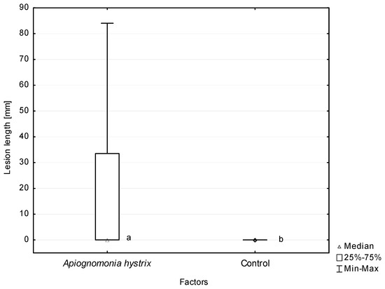 Lengths of necrotic lesions on petioles inoculated with Apiognomonia hystrix and in the control, eight weeks post inoculation. Values indicated with different letters have been determined significantly different at α = 0.05 in Mann–Whitney U test.