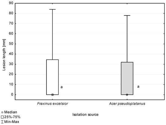 According to the Mann–Whitney U test, the host origin of the isolates did not differentiate them with regard to the ability to cause necroses on petioles of the studied tree species (Figure 10). All the isolates used in the inoculations caused statistically significantly larger necroses on A. pseudoplatanus petioles compared to those on F. excelsior petioles (Figure 11).