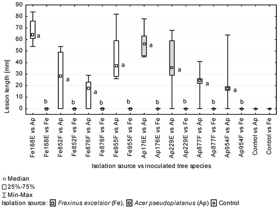 Lengths of necrotic lesions on Fraxinus excelsior (Fe) and Acer pseudoplatanus (Ap) petioles inoculated with Apiognomonia hystrix isolates originating from Fraxinus excelsior and Acer pseudoplatanus, eight weeks post inoculation. Values within groups (created by combining the data for the same isolates) marked with different letters indicate statistically significant differences between host species according to the Mann–Whitney U test with significance threshold α = 0.05.