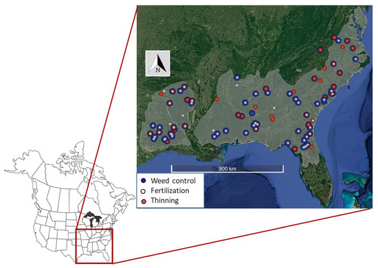 Linking vegetation and ecosystem C dynamics to management decisions could be impactful for the C economy of the southeastern United States (SE US). In this region, plantations managed for wood production occupy 34.7 × 106 hectares [10] and store ~2.6 Pg of soil C to 100 cm [11]. Overall, aboveground tree biomass contains an estimated ~4.8 Pg C in the SE US [12], with the region’s pine forests (plantation and natural stands) having the greatest productivity among forest types [13]. The productive potential of pine and the coverage of plantations likely makes this forest type an important component of a forested landscape that Han et al. [14] estimated removes the equivalent of 11% of the annual anthropogenic CO2 emissions released in the SE US. The role of pine plantations in regional C cycling may have been further accentuated between the middle 20th and the early 21st century because of a several fold increase in plantation pine growth [3]. This improved productivity mostly occurred for reasons linked to silviculture [15] and the planting of improved tree genetics [16], and suggests that overall C sequestration could have increased in the region’s plantations [17]. However, even where management has increased pine growth, whole ecosystem C storage has shown only a moderate gain [18,19] and sometimes no significant increase [20] at the time of final harvest. To date, the case studies examining silviculture-C accumulation linkages have been limited in spatial scope or management strategy, highlighting the need for regional sampling that examines a range of approaches to plantation management.