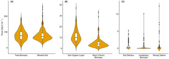 Violin plots showing the interquartile range (white box, vertical line is 1.5 × range), median (cross bar), and probability density function (shaded area) of the C distribution among pools of (A) tree biomass and mineral soils to 100 cm, (B) soil organic layers and live roots, and (C) soil detritus, understory biomass and woody debris across the managed loblolly pine plantations. Note the Y-axis scale decreases from panel A to C and that extreme outliers are not included for some categories so that the probability density functions are fully visible.