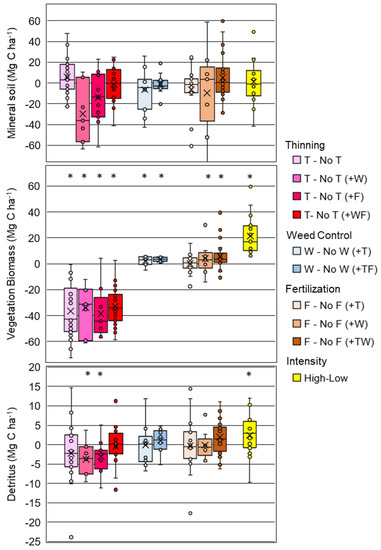 Box plots (x = mean, line = median) of treatment differences (e.g., F-No F or F vs. No F) for the mineral soil to 100 cm (top panel), vegetation biomass (mid panel) and detritus (bottom panel) for comparisons of thinning (T), weed control (W), fertilization (F), and high versus low management intensity treatments. Additional treatments applied across both plots in a contrast are in parentheses (e.g., (+TF)). The (*) indicates a significant contrast.
