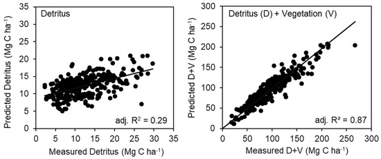 The regression model results presented as measured versus predicted values for (left panel) detritus and (right panel) detritus plus vegetation (D + V). Two points in the detritus model were deemed high leverage (Cook’s D statistic) and removed from the analysis.