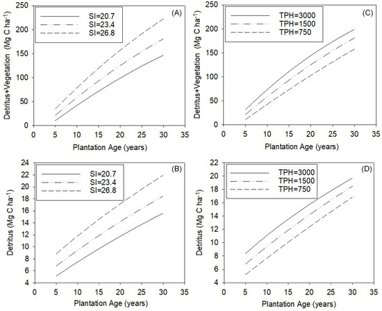 (A–D) Modeled estimates of detritus + vegetation and detritus pools with plantation age for the average of the upper, mid, and lower thirds (A,B) for site index (SI) values at a fixed initial planting density of 1500 trees per hectare (TPH), and (C,D) varying initial planting densities at a fixed SI = 23.4.