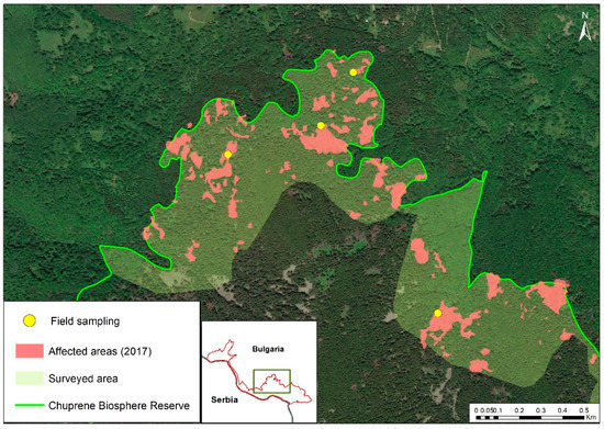 This research was funded by the Regional Inspection of Environmental and Waters at Montana at Ministry of Environmental and Waters of Bulgaria, Project ‘Monitoring of the sanitary condition of the forest stands in the Gornata Koria and Chuprene Reserves’, Contract N04/13.07.2017.