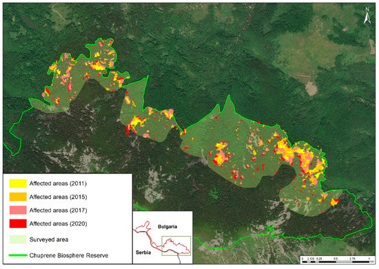 In the Chuprene Reserve, the spruce stands are predominately mature. It is well known that I. typographus attacks trees older than 70 years and the dynamics of outbreaks largely depends on higher proportions of spruce trees in a stand, insect abundance, tree susceptibility, weather conditions, and human measures [10]. There are about 120 species of bark beetles in Bulgaria, and over 20 of them are trophically associated with spruces. However, detailed studies on damages caused by spruce bark beetle in the Chuprene Reserve have not been conducted.