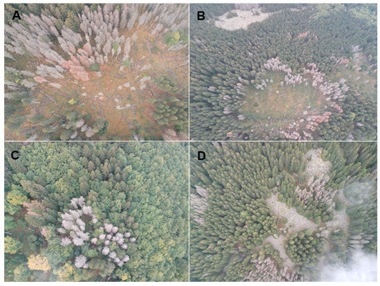 Spruce stands under attack by Ips typographus: (A)—expanded bark beetle spot; (B)—merged bark beetle spots; (C)—emerged bark beetle spot; (D)—bark beetle spots near rock screes.